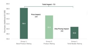 Our analysis found that drip pricing significantly decreases purchasing intent. Purchase likelihood decreased by -7.5 points (on a 0-100 rating) between Group 1’s initial product rating and their total basket rating (see Figure 2).  Then, Group 2’s product rating allows us to deconstruct this 7.5-point fall into the impact of the increased cost versus drip pricing irritation. Purchase likelihood decreases by -2.9 points between the product ratings of Group 1 and 2, showing the impact of the increase in price. Hence the majority of the Group 1 drop, -4.6 points, is attributable to the drip pricing ambush.