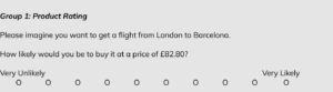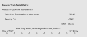Our experiment measured the impact of drip pricing using two different groups of respondents, assigned at random. Group 1, whose journey is shown in Figure 1, replicates the structure of a drip pricing journey.  Initially they see a base price (£82.80 in the Figure 1 example) and then an additional 10% charge is added to the basket before payment, yielding a total of £92.00. Group 2 replicates an equivalent online journey with only one question, as the total price of £92.00 is seen upfront as the product price.